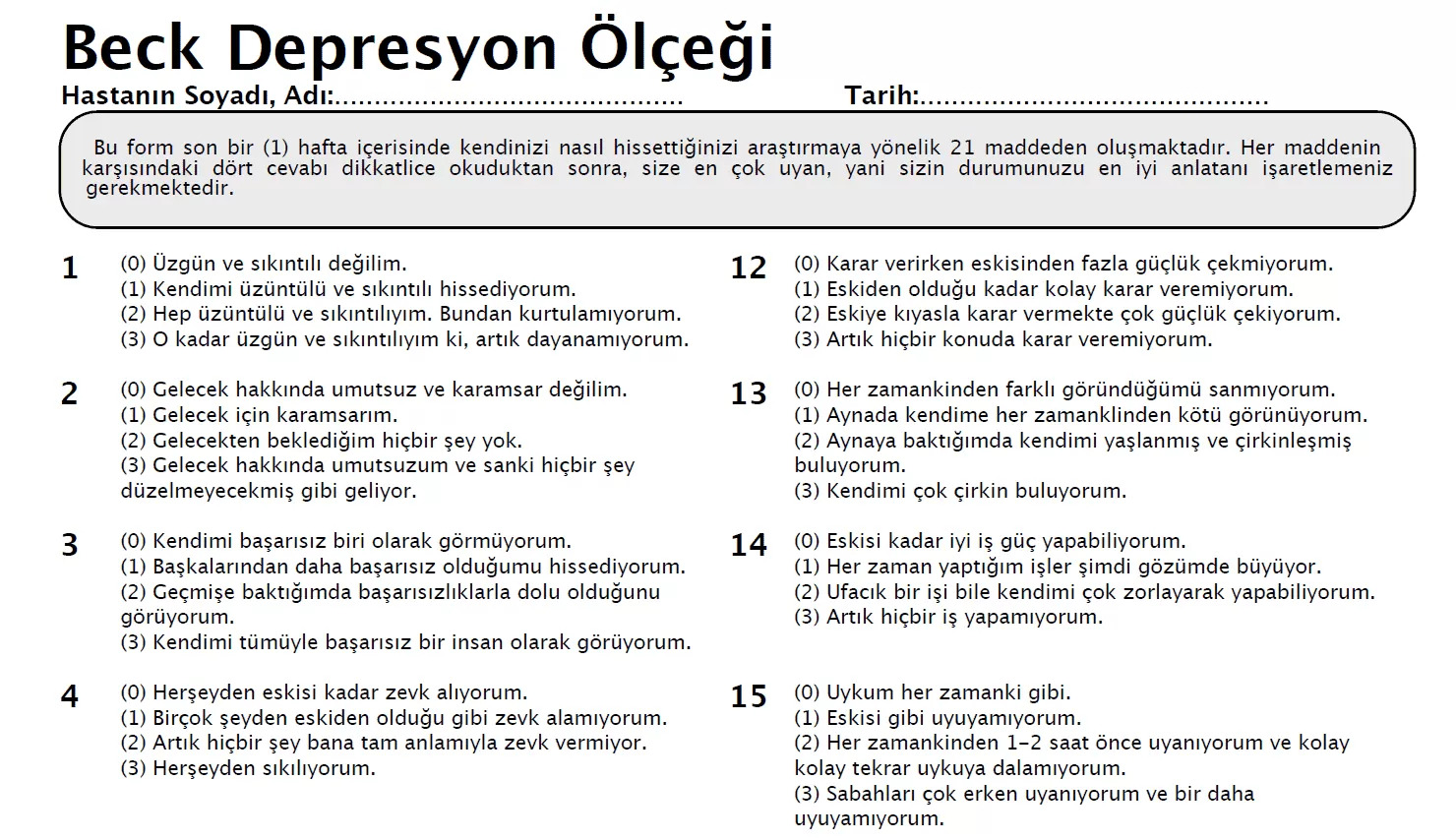 Test, 21 sorudan oluşur ve bireylerin depresyon belirtileri hakkında kendilerini değerlendirmelerini sağlar. Sorular, üzüntü, umutsuzluk, suçluluk duyguları, enerji düzeyi, uyku düzeni gibi depresyon belirtileri üzerine odaklanır. Bireyler her bir soruya belirli bir puan verir ve toplam puanlarına göre depresyon düzeyleri belirlenir. Test sonuçları, bireyin depresyon riskini belirlemede ve tedavi sürecinde yol gösterici olabilir.